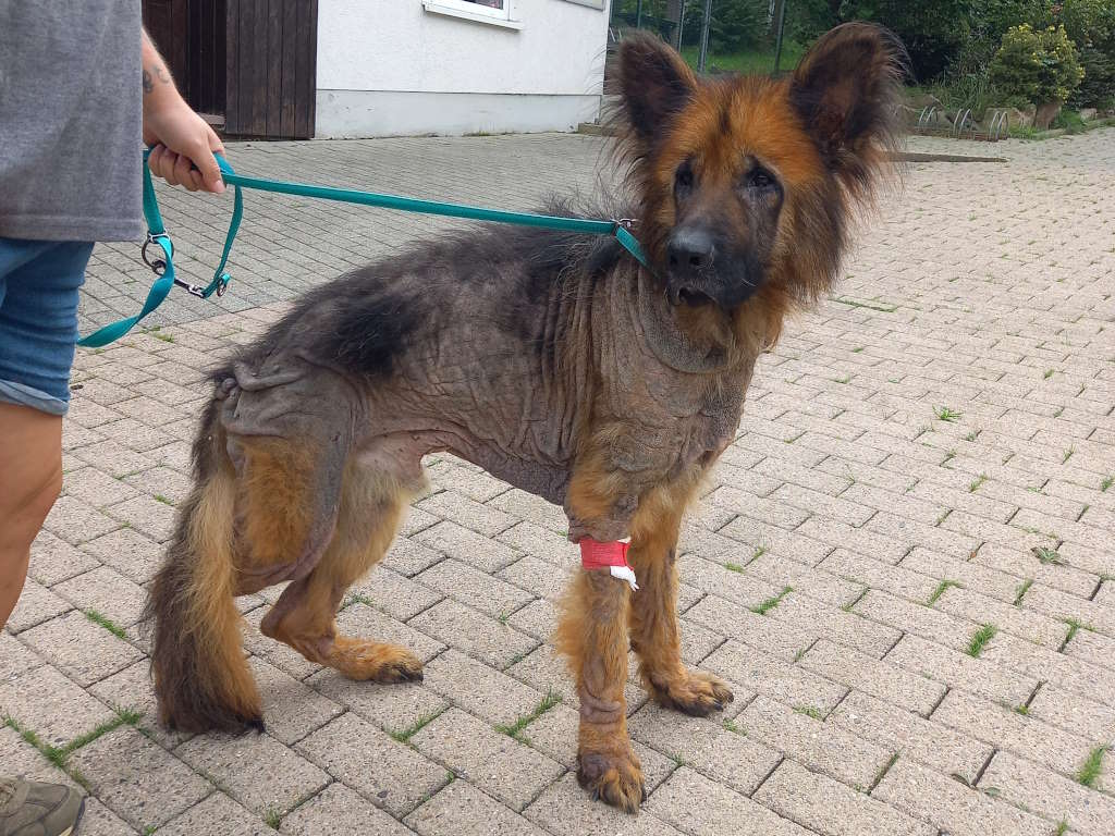 Die wahre Schönheit des fünfjährigen Altdeutschen Schäferhundes lässt sich hinter der kahlen Haut, den viel zu langen Krallen, den juckenden Ohren und den zahlreichen Pusteln nur erahnen. Beim Tierarzt wurden Blut abgenommen und ein Hautgeschabsel entnommen, die Ohren gereinigt und die Krallen etwas gekürzt.