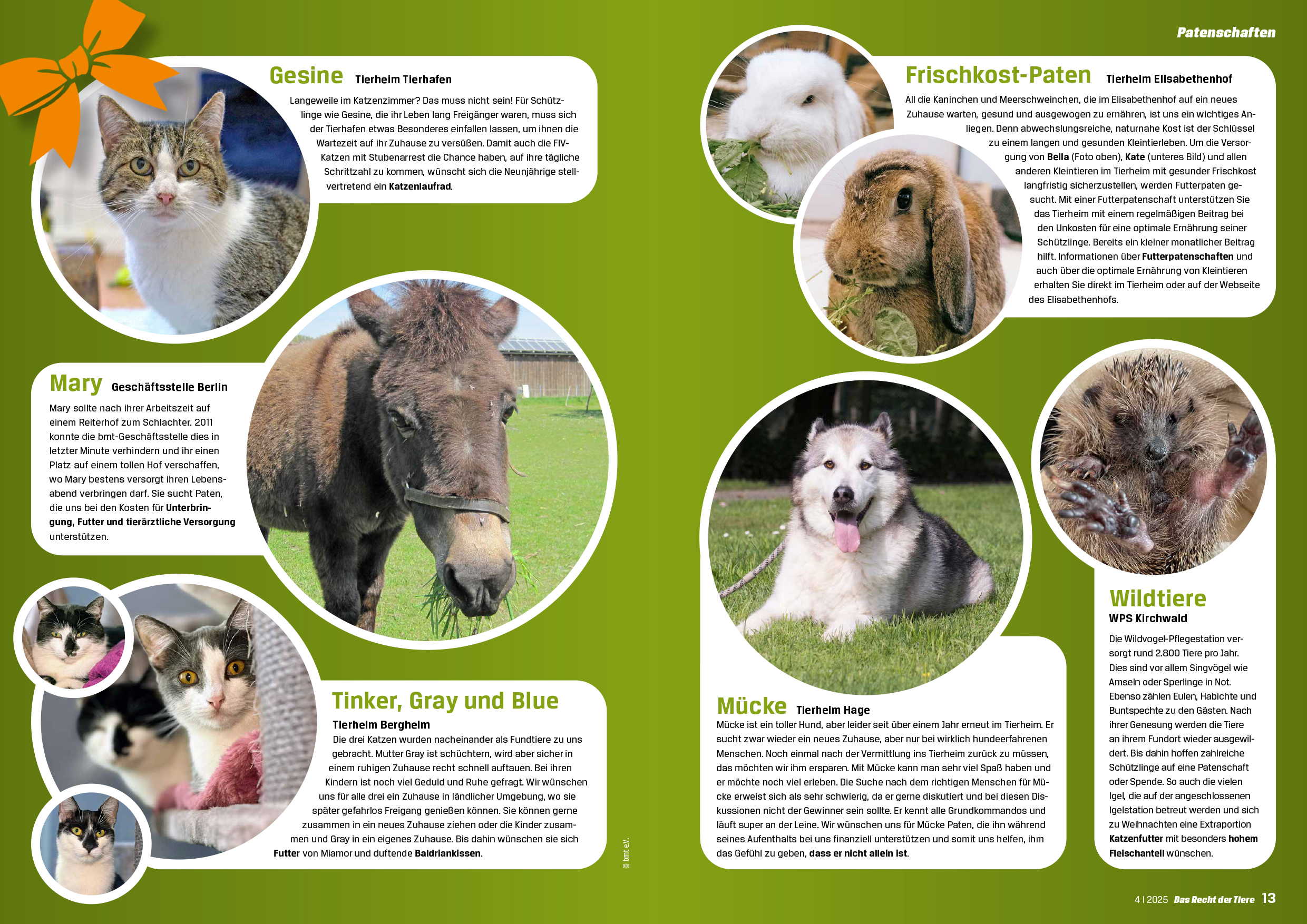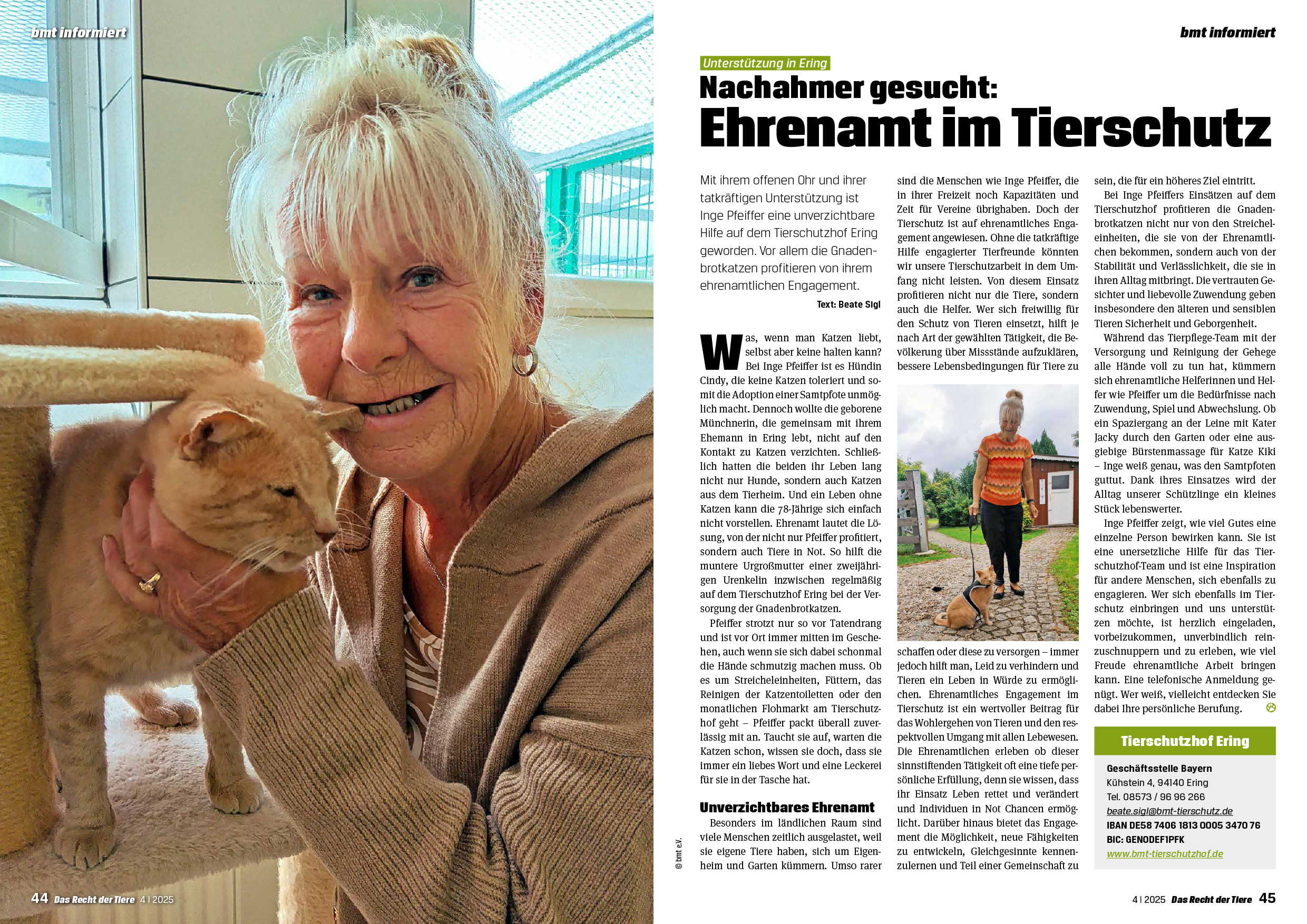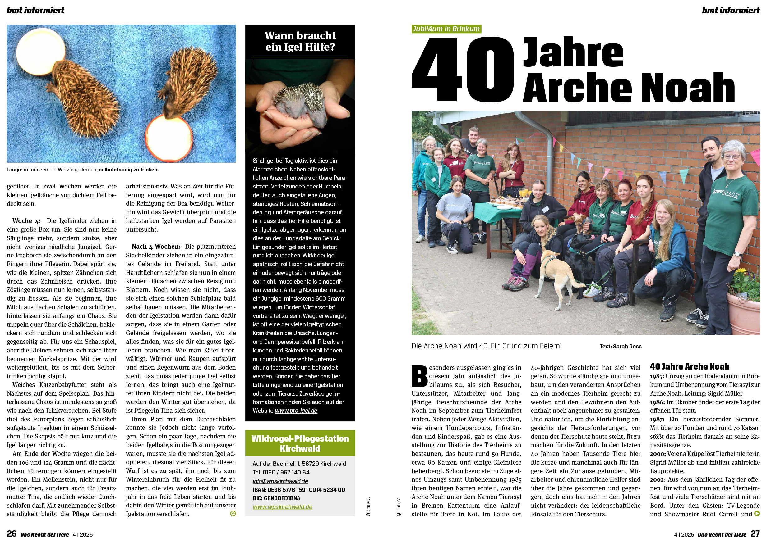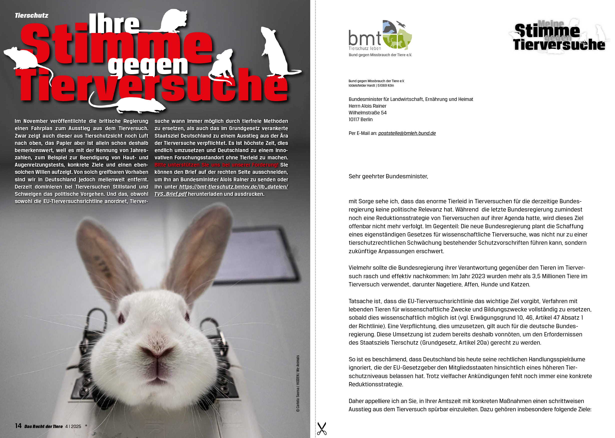 "Das Recht der Tiere", kurz RdT, ist das Tierschutzmagazin des bmt, das viermal jährlich in einer Auflage von 16.000 Exemplaren erscheint.